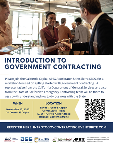 Please join the California Capital APEX Accelerator and the Sierra SBDC for a workshop focused on getting started with government contracting. A representative from the California Department of General Services, California Office of Emergency Services, and California Office of Recreation and Parks will also be there to assist with understanding how to do business with the State.