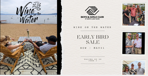 An iconic lakeside celebration where exceptional wine, inspired cuisine, and community come together with purpose. Wine on the Water invites you to sip and savor along the shores of North Lake Tahoe while supporting local youth and working families. Enjoy curated tastings from premium wineries, bites from top local chefs, live music, and a dynamic auction, all set against a breathtaking backdrop. Every ticket supports programs that provide affordable childcare, academic support, meals, and life-changing opportunities for kids in our region. Where every glass gives a kid a future in North Lake Tahoe.